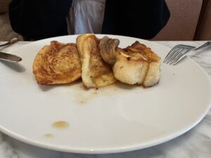 フレンチトーストにはバナナとメープルシロップがかかっています。