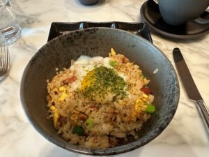 フライドライスにはシーフードやベーコン、その上に温泉卵が乗っています。ちょっと朝には重かったです(笑)