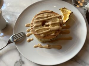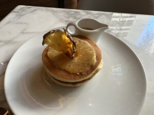 パンケーキの上にはキャラメリゼしたパイナップルが乗っておりドライパイナップルが刺さっています。
