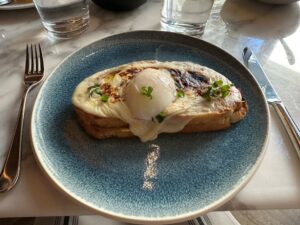 クロックマダムはハムとチーズ、その上に温泉卵が乗っていました。卵を崩して一緒に食べたら絶品です!